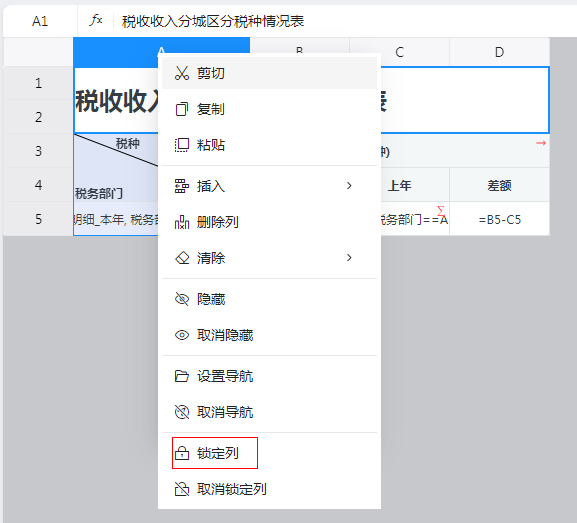 以“税收收入分城区分税种情况表”为例,由于横向扩展数据较多,需将行头固定,设置方法:选择A列列头右键选择“锁定列”,如下图: