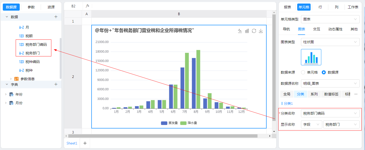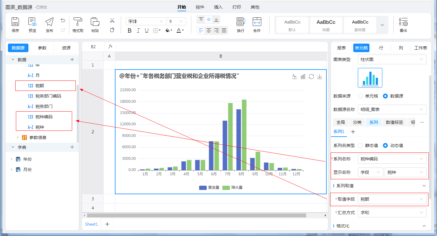 系列名称为“税种编码”,显示名称为“税种”,取值字段为“税额”,如下图: