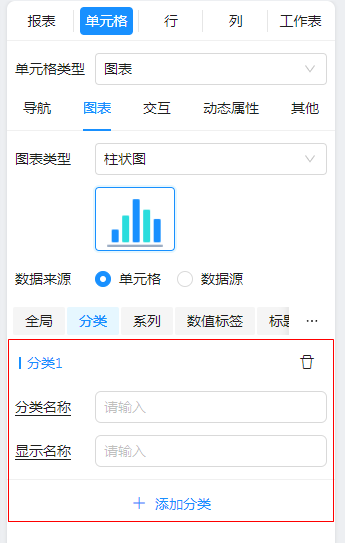 根据图表分类数据分布情况进行设置,数据来源为“单元格”时,图表分类可以设置多个,点击下方的“添加分类”按钮进行增加。